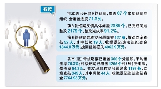 目前,市本级前8轮巡察共移交问题线索127条,推动立案查处52人,其中处级19人,收缴退还违法违纪资金1344.8万元,挽回经济损失4062.9万元。各市(区)发现和移交问题线索1197条,推动立案查处345人,其中科级44人,收缴退还违法违纪资金7764.93万元。