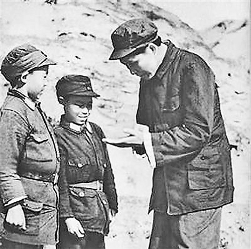 1939年4月24日上午,毛泽东乘车来到位于延安东关黑龙沟的抗大校务部,参加抗大生产运动初步总结大会。当他快到抗大校务部门前时,有两个小八路从山坡上跑下来,兴冲冲地来到毛主席跟前,向毛主席问好。