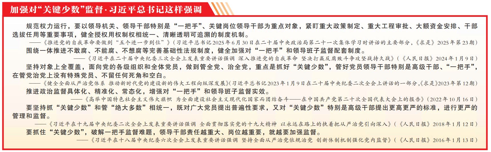 新时代新征程上,只有抓住“关键少数”,以有效监督管好“一把手”和领导班子,才能充分发挥领导干部的先锋模范作用和以上率下作用,才能团结带领广大干部群众坚定信心、鼓足干劲、共同奋斗。各级“一把手”和领导班子要自觉主动接受监督,习惯在受监督和约束的环境中工作生活,带头落实党内各项规章制度,展现担当作为。